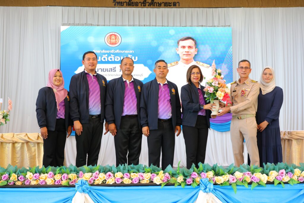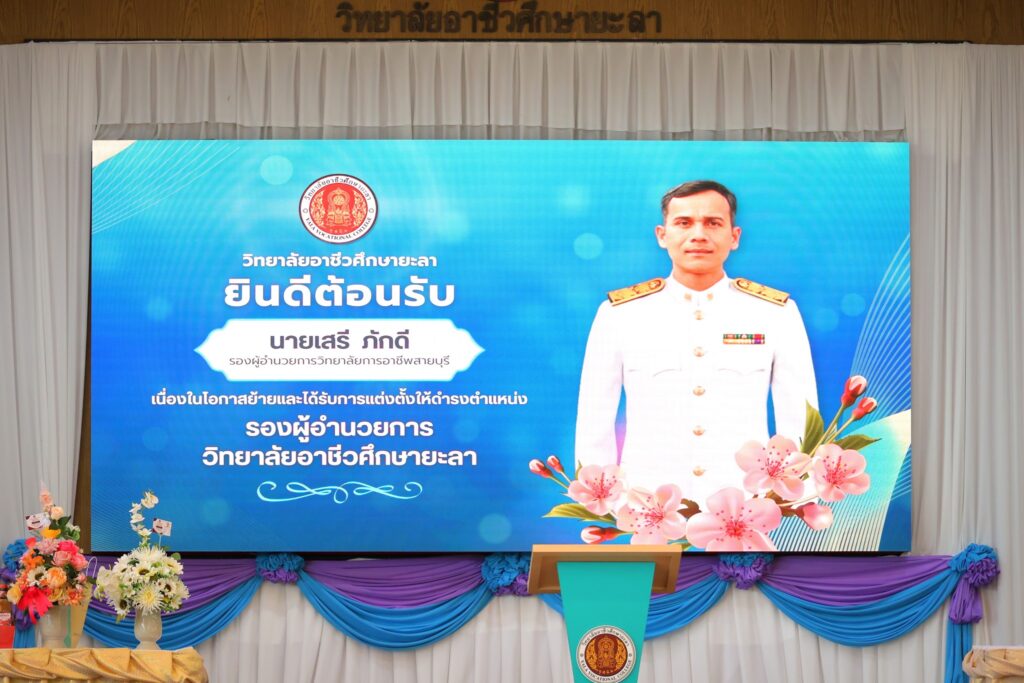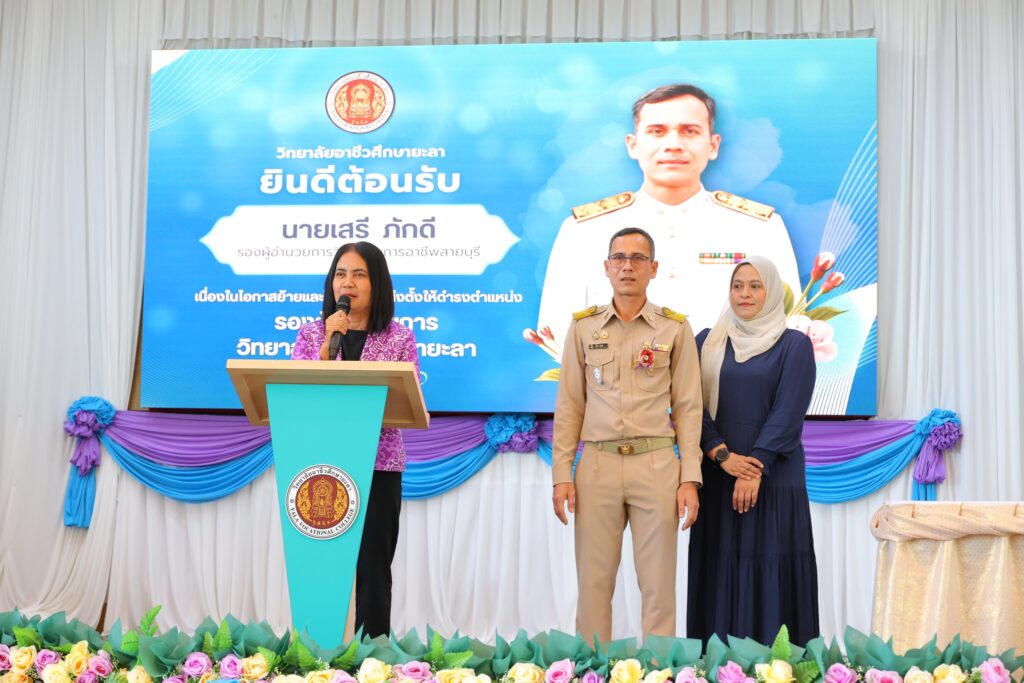 นางประกายแก้ว ศุภอักษร ผู้อำนวยการวิทยาลัยอาชีวศึกษายะลา พร้อมด้วยคณะผู้บริหาร คณะครู และบุคลากรทางการศึกษา ร่วมแสดงความยินดีและให้การต้อนรับ นายเสรี ภักดี รองผู้อำนวยการวิทยาลัยการอาชีพสายบุรี เนื่องในโอกาสย้ายและได้รับการแต่งตั้งให้ดำรงตำแหน่ง รองผู้อำนวยการวิทยาลัยอาชีวศึกษายะลา ซึ่งมีคณะผู้บริหาร สังกัดสำนักงานอาชีวศึกษาจังหวัดยะลา ร่วมให้การแสดงความยินดี และให้การต้อนรับ ณ ห้องประชุมปาหนัน วิทยาลัยอาชีวศึกษายะลา
