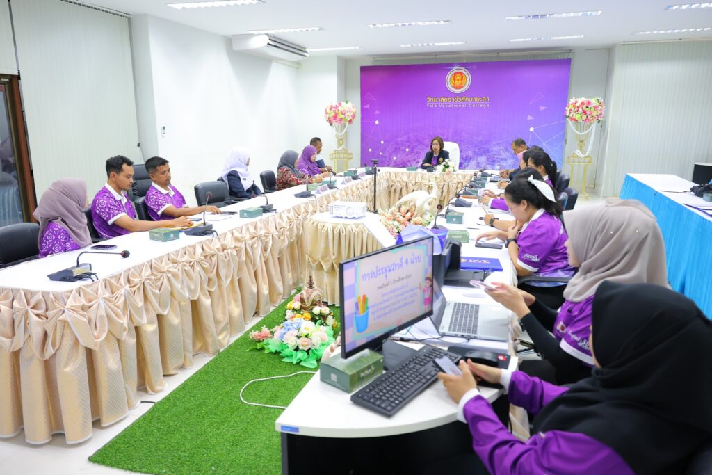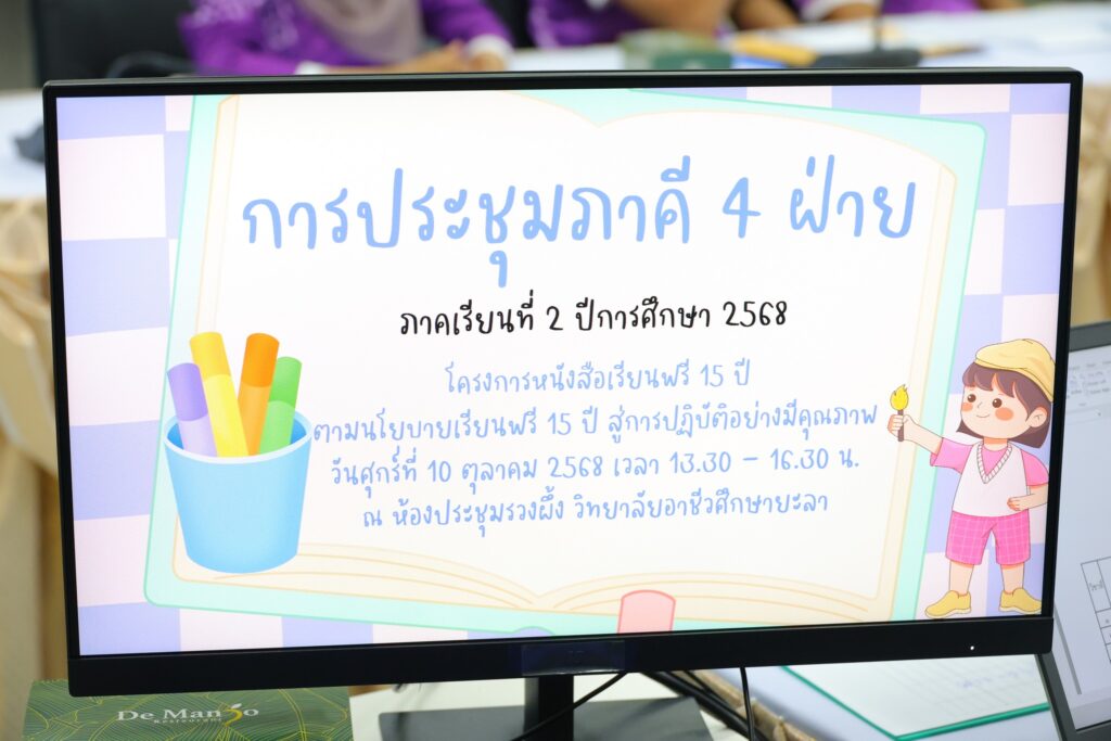 นางประกายแก้ว ศุภอักษร ผู้อำนวยการวิทยาลัยอาชีวศึกษายะลา เป็นประธานในการประชุมภาคี 4 ฝ่าย ประจำภาคเรียนที่ 2 ปีการศึกษา 2568 โครงการหนังสือเรียนฟรี 15 ปี ตามนโยบายเรียนฟรี 15 ปี สู่การปฏิบัติอย่างมีคุณภาพ โดยมี ผู้แทนภาคี 4 ฝ่าย ได้แก่ ผู้แทนชุมชน ผู้แทนครู ผู้แทนผู้ปกครอง ผู้แทนนักเรียน คณะครูหัวหน้าแผนกวิชา และบุคลากรทางการศึกษาที่เกี่ยวข้อง เข้าร่วมการประชุม ณ ห้องประชุมรวงผึ้ง อาคารอำนวยการ วิทยาลัยอาชีวศึกษายะลา