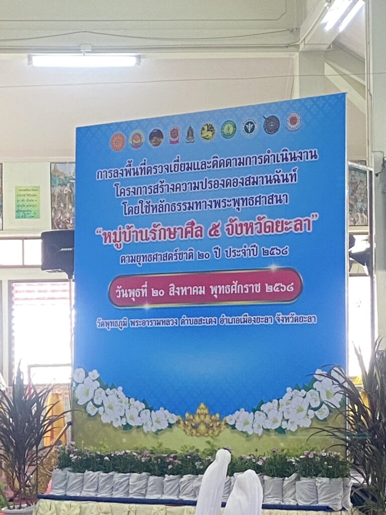 นางประกายแก้ว ศุภอักษร ผู้อำนวยการวิทยาลัยอาชีวศึกษายะลา มอบหมายให้ นางสาวรพีพรรณ แก้วคง หัวหน้าแผนกวิชาการบัญชี เข้าร่วมพิธีเปิดการตรวจเยี่ยมโครงการสร้างความปรองดองสมานฉันท์ โดยใช้หลักธรรมทางพระพุทธศาสนา “หมู่บ้านรักษาศีล 5” ตามแผนยุทธศาสตร์ชาติ 20 ปี) ประจำปีงบประมาณ พ.ศ.2568 ณ วัดพุทธภูมิ พระอารามหลวง ตำบลสะเตง อำเภอเมืองยะลา จังหวัดยะลา