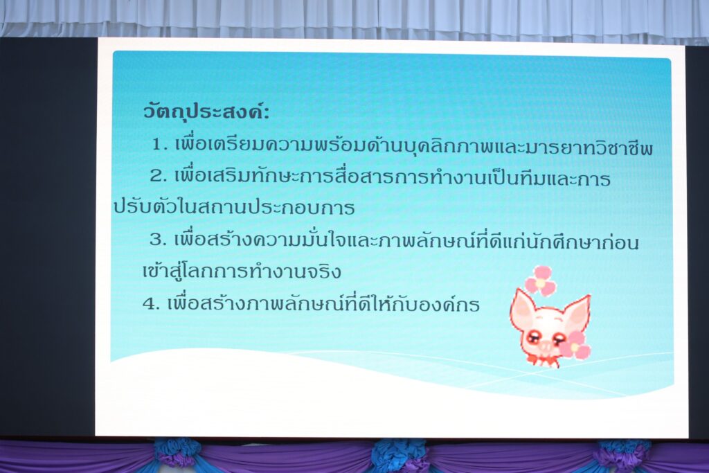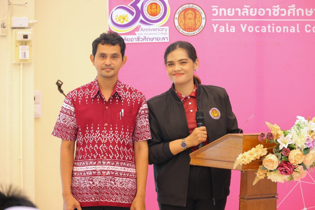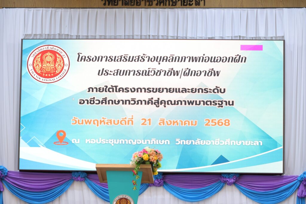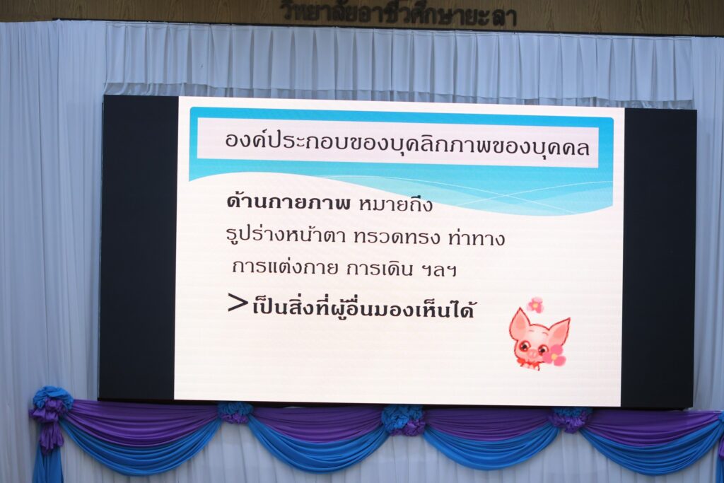 นางประกายแก้ว ศุภอักษร ผู้อำนวยการวิทยาลัยอาชีวศึกษายะลา มอบหมายให้ นายวสุชากร แก้วไฝ รองผู้อำนวยการฯ ฝ่ายวิชาการ เป็นประธานในพิธีเปิดโครงการเสริมสร้างบุคลิกภาพก่อนออกฝึกประสบการณ์วิชาชีพ/ฝึกอาชีพ ภายใต้โครงการขยายและยกระดับอาชีวศึกษาทวิภาคีสู่คุณภาพมาตรฐาน โดยมี นางนูรีดา กูโน ปฏิบัติหน้าที่ รองผู้อำนวยการฯ ฝ่ายพัฒนากิจการนักเรียน นักศึกษา พร้อมด้วยคณะครู และนักเรียน นักศึกษา แผนกวิชาการจัดการธุรกิจค้าปลีก และแผนกวิชาเทคโนโลยีธุรกิจดิจิทัล เข้าร่วมโครงการ ซึ่งได้รับเกียรติจาก นางกิ่งกาญจน์ รักษาสัตย์ ข้าราชการบำนาญ สังกัด ศอ.บต. และ นางสุพิศ บุญสืบ นักวิชาการวัฒนธรรมชำนาญการ เป็นวิทยากรบรรยายให้ความรู้ ณ หอประชุมกาญจนาภิเษก วิทยาลัยอาชีวศึกษายะลา