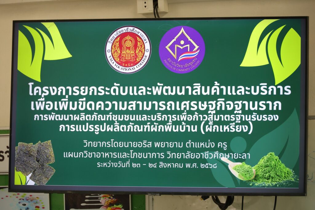 นางประกายแก้ว ศุภอักษร ผู้อำนวยการวิทยาลัยอาชีวศึกษายะลา พร้อมด้วย นางนูรีดา กูโน ปฏิบัติหน้าที่ รองผู้อำนวยการฯ ฝ่ายพัฒนากิจการนักเรียน นักศึกษา เยี่ยมให้กำลังใจกลุ่มชาวบ้าน ในโครงการยกระดับและพัฒนาสินค้าและบริการ เพื่อเพิ่มขีดความสามารถเศรษฐกิจฐานราก การพัฒนาผลิตภัณฑ์ชุมชนและบริการเพื่อก้าวสู่มาตรฐานรับรอง การแปรรูปผลิตภัณฑ์ผักพื้นบ้าน (ผักเหรียง) โดยวิทยาลัยชุมชนยะลา ซึ่งมี นายอริส พยายาม ครูแผนกวิชาอาหารและโภชยาการ วิทยาลัยอาชีวศึกษายะลา เป็นวิทยากรบรรยายให้ความรู้แก่กลุ่มชาวบ้านตำบลลำใหม่ ระหว่างวันที่ 23-24 สิงหาคม 2568 ณ ห้อง 311 อาคารคหกรรม วิทยาลัยอาชีวศึกษายะลา