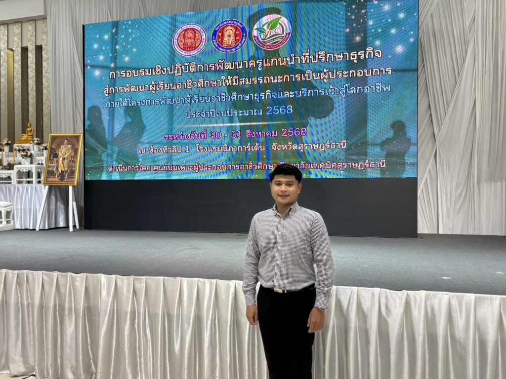 นางประกายแก้ว ศุภอักษร ผู้อำนวยการวิทยาลัยอาชีวศึกษายะลา มอบหมายให้ นายอริส พยายาม ครูแผนกวิชาอาหารและโภชนาการ เข้าร่วมอบรมเชิงปฏิบัติการพัฒนาครูแกนนำที่ปรึกษาธุรกิจสู่การพัฒนาผู้เรียนอาชีวศึกษาให้มีสมรรถนะการเป็นผู้ประกอบการ ภายใต้โครงการพัฒนาผู้เรียนอาชีวศึกษาธุรกิจและบริการเข้าสู่โลกอาชีพ ประจำปีงบประมาณ 2568 ระหว่างวันที่ 30-31 สิงหาคม 2568 ณ ห้องทิวลิป 1 โรงแรมนิภาการ์เด้น จังหวัดสุราษฎร์ธานี