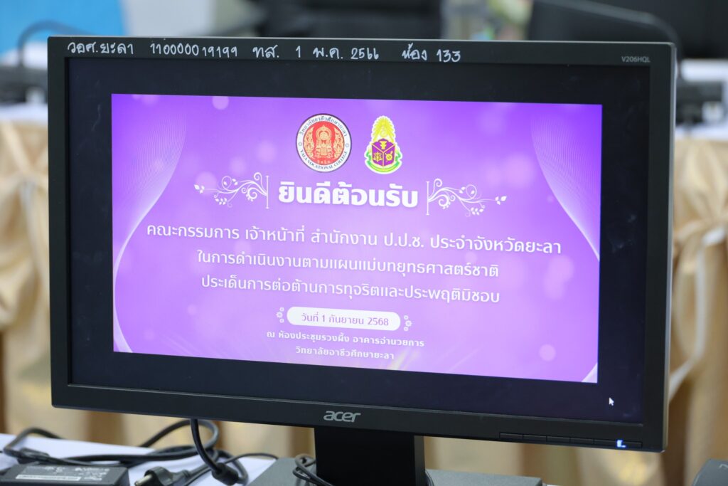 นางประกายแก้ว ศุภอักษร ผู้อำนวยการวิทยาลัยอาชีวศึกษายะลา พร้อมด้วยคณะผู้บริหาร ร่วมให้การต้อนรับ นายซอลีฮีน เตาฮีด เจ้าพนักงานป้องกันการทุจริตชำนาญการ ผู้แทนของสำนักงาน ป.ป.ช. ประจำจังหวัดยะลา และคณะ ในการติดตามการดำเนินงานตามแผนแม่บทยุทธศาสตร์ชาติ ประเด็นการต่อต้านการทุจริตและประพฤติมิชอบ โดยมีคณะครู บุคลากรทางการศึกษา และนักศึกษา ร่วมสนับสนุนข้อมูล ณ ห้องประชุมรวงผึ้ง อาคารอำนวยการ วิทยาลัยอาชีวศึกษายะลา