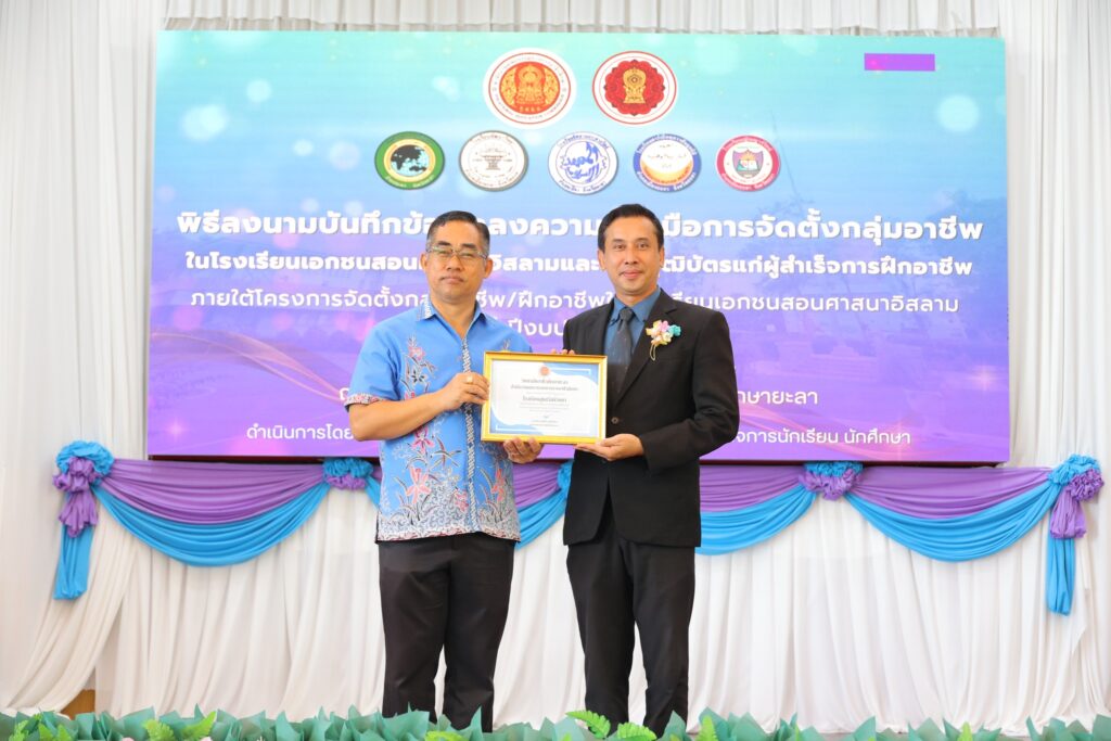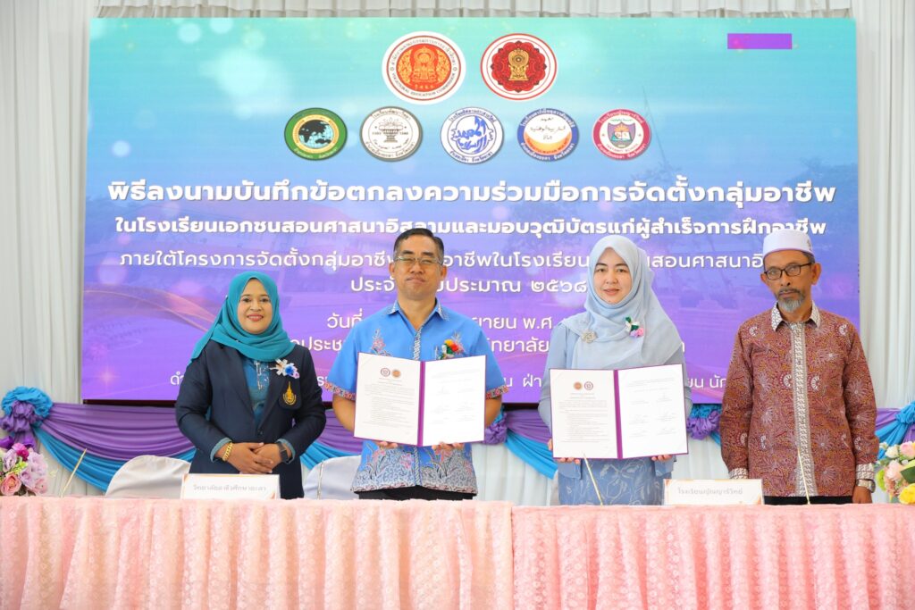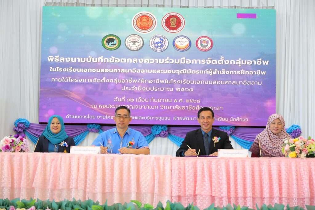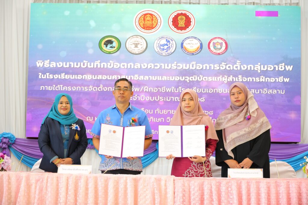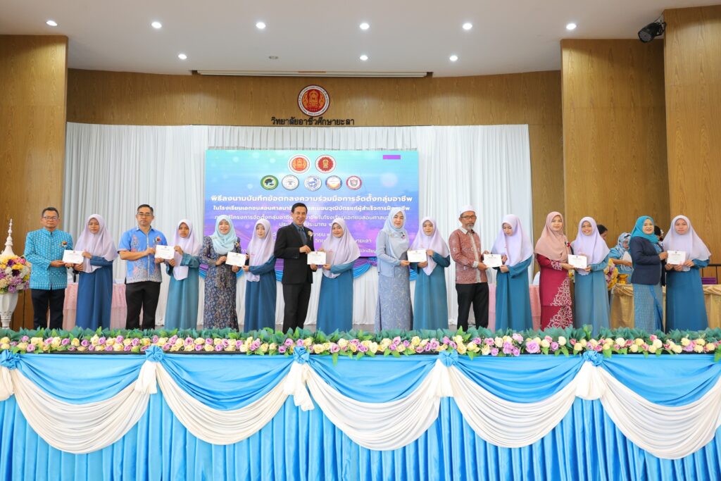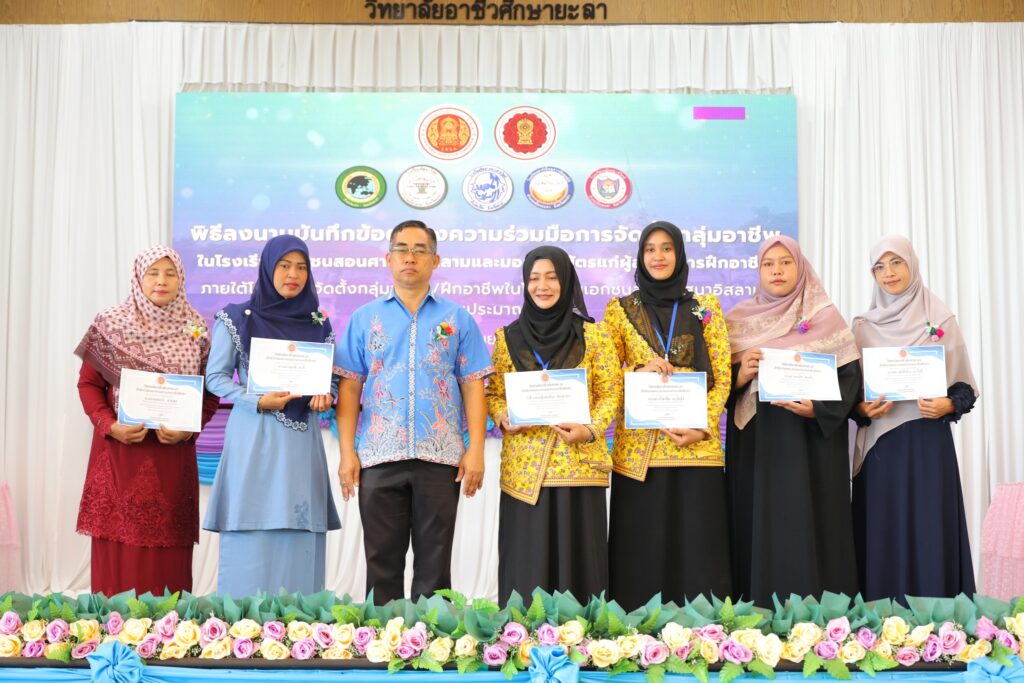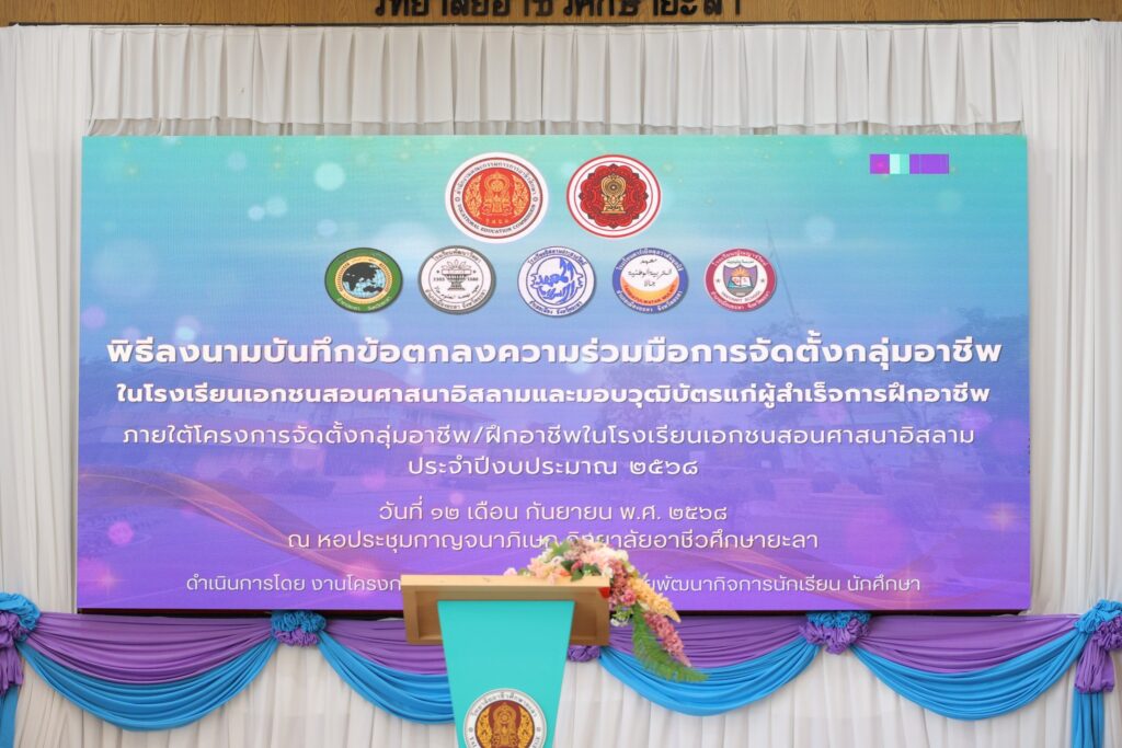นางประกายแก้ว ศุภอักษร ผู้อำนวยการวิทยาลัยอาชีวศึกษายะลา มอบหมายให้ นายเอกองค์ หลงราม รองผู้อำนวยการฯ ฝ่ายแผนงานและความร่วมมือ เป็นประธานในพิธีลงนามบันทึกข้อตกลงความร่วมมือการจัดตั้งกลุ่มอาชีพในโรงเรียนเอกชนสอนศาสนาอิสลามและมอบวุฒิบัตรแก่ผู้สำเร็จการฝึกอาชีพ ภายใต้โครงการจัดตั้งกลุ่มอาชีพฝึกอาชีพในโรงเรียนเอกชนสอนศาสนาอิสลาม ประจำปีงบประมาณ พ.ศ. 2568 โดยมี นางนูรีดา กูโน ปฏิบัติหน้าที่ รองผู้อำนวยการฯ ฝ่ายพัฒนากิจการนักเรียน นักศึกษา เป็นผู้กล่าวรายงาน ซึ่งมีผู้เข้าร่วมฝึกอาชีพทั้งหมด 100 คน รวม 4 หลักสูตร ดังนี้