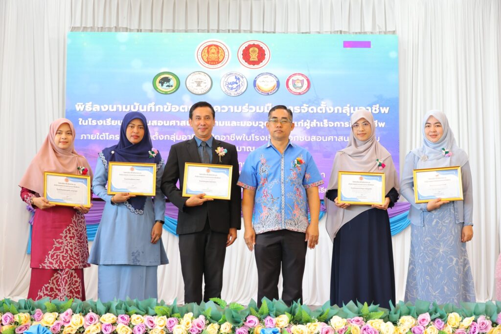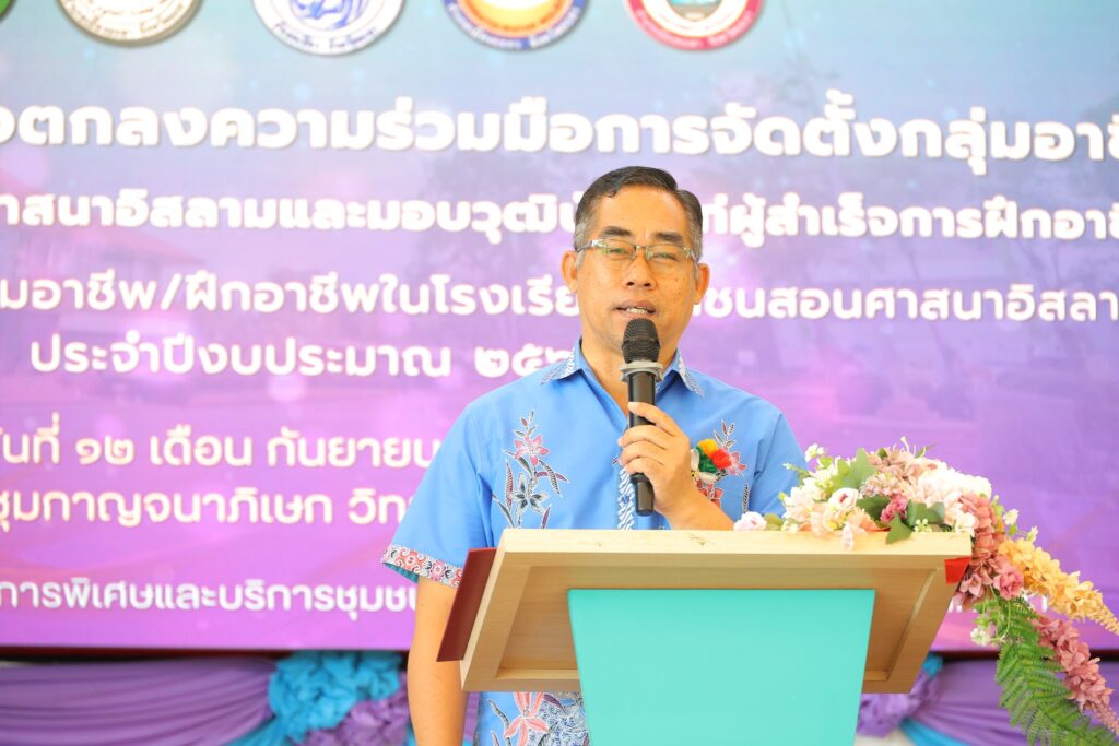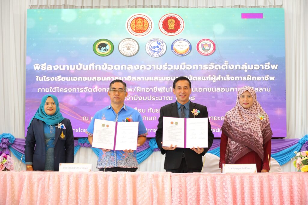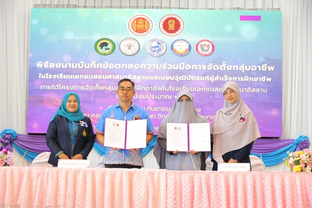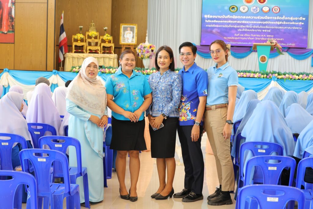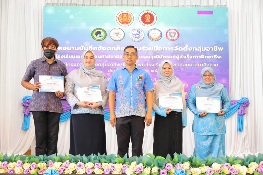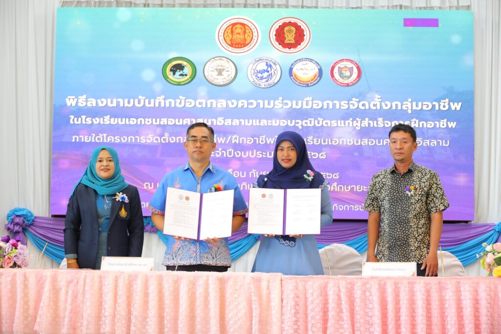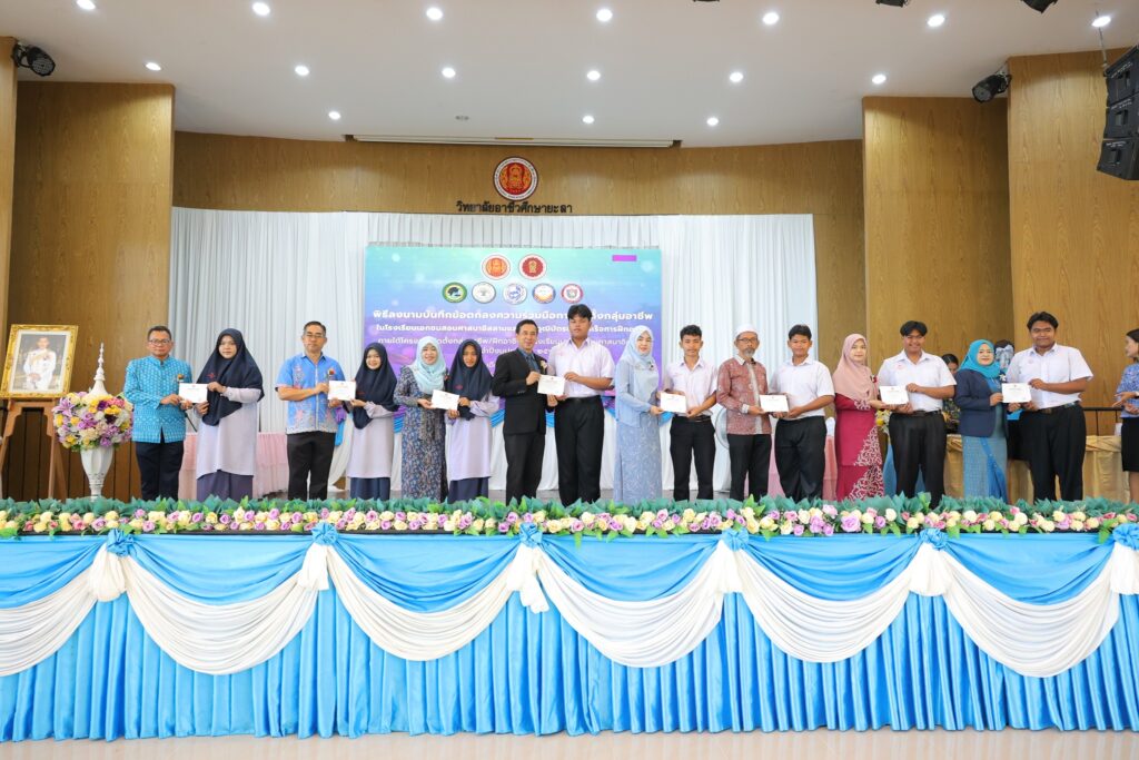 นางประกายแก้ว ศุภอักษร ผู้อำนวยการวิทยาลัยอาชีวศึกษายะลา มอบหมายให้ นายเอกองค์ หลงราม รองผู้อำนวยการฯ ฝ่ายแผนงานและความร่วมมือ เป็นประธานในพิธีลงนามบันทึกข้อตกลงความร่วมมือการจัดตั้งกลุ่มอาชีพในโรงเรียนเอกชนสอนศาสนาอิสลามและมอบวุฒิบัตรแก่ผู้สำเร็จการฝึกอาชีพ ภายใต้โครงการจัดตั้งกลุ่มอาชีพฝึกอาชีพในโรงเรียนเอกชนสอนศาสนาอิสลาม ประจำปีงบประมาณ พ.ศ. 2568 โดยมี นางนูรีดา กูโน ปฏิบัติหน้าที่ รองผู้อำนวยการฯ ฝ่ายพัฒนากิจการนักเรียน นักศึกษา เป็นผู้กล่าวรายงาน ซึ่งมีผู้เข้าร่วมฝึกอาชีพทั้งหมด 100 คน รวม 4 หลักสูตร ดังนี้