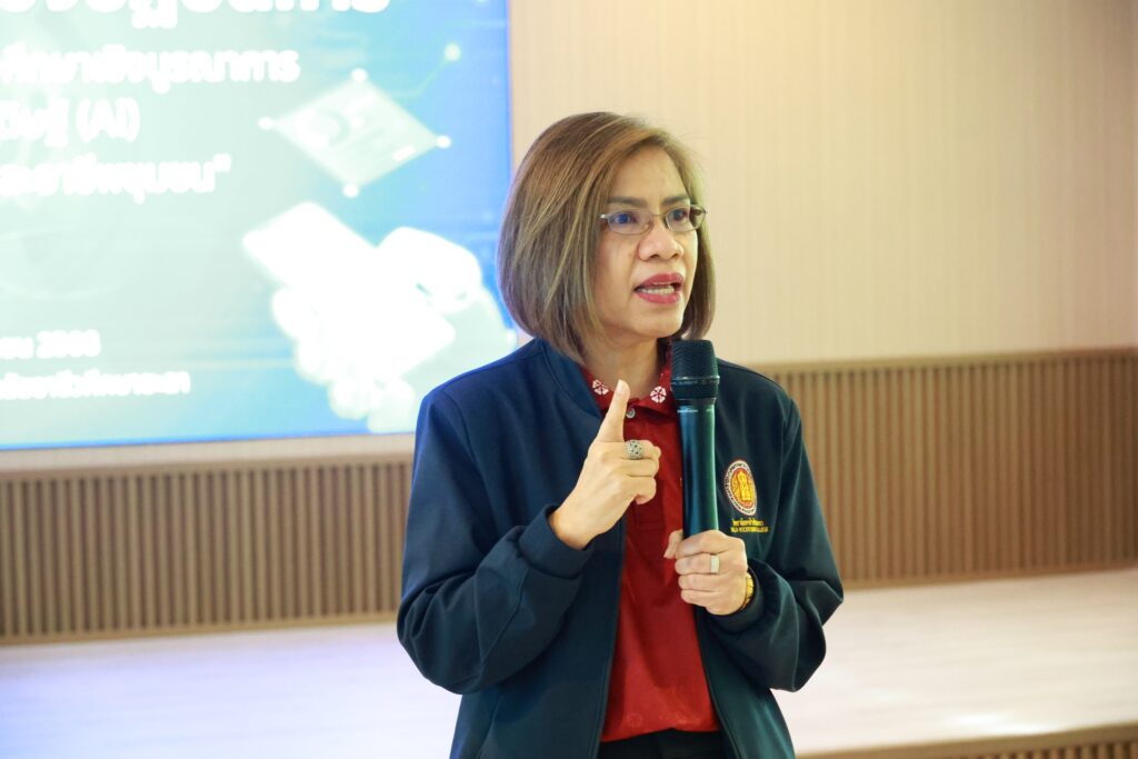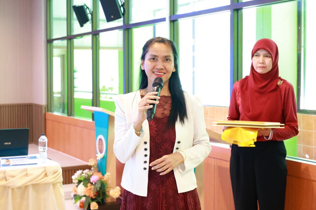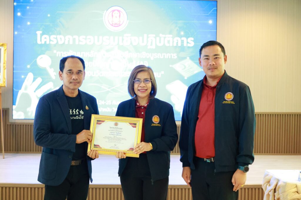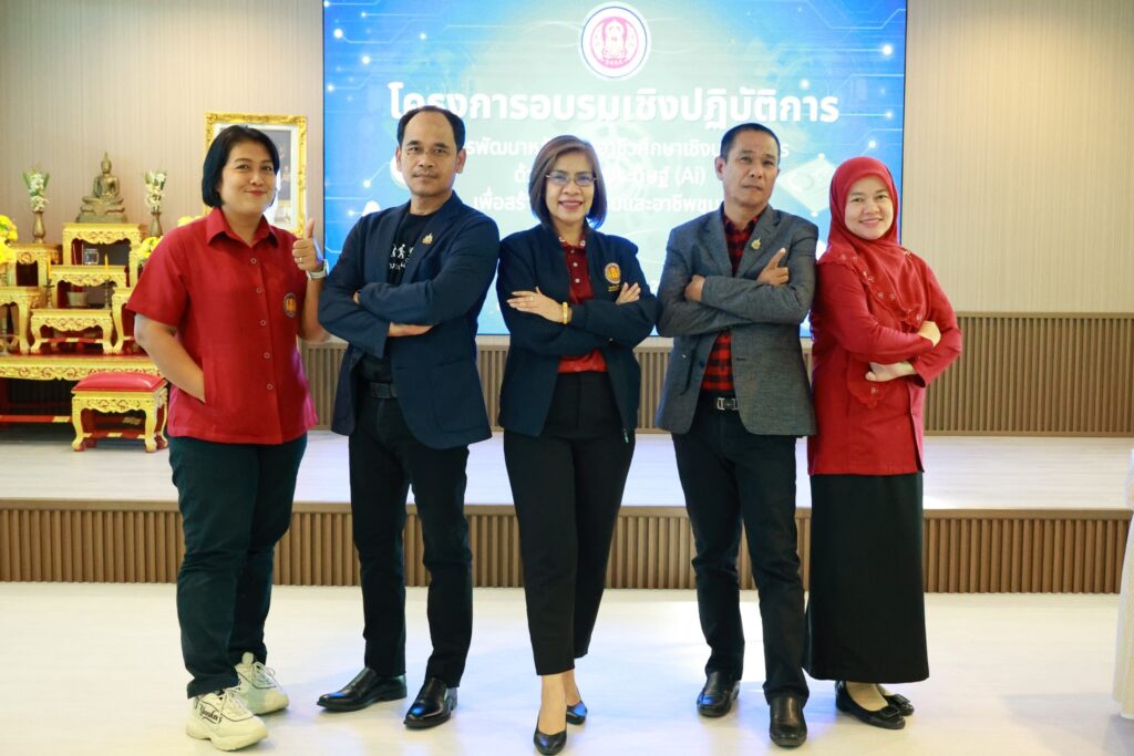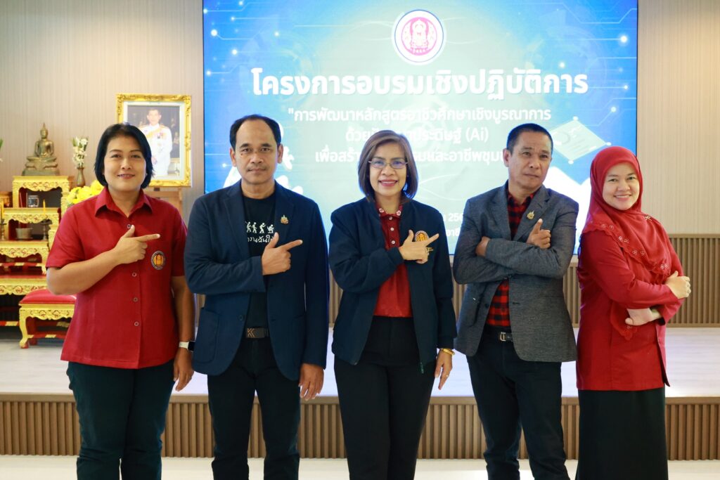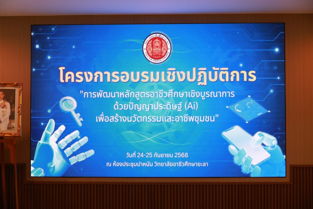 นางประกายแก้ว ศุภอักษร ผู้อำนวยการวิทยาลัยอาชีวศึกษายะลา เป็นประธานพิธีปิดโครงการอบรมเชิงปฏิบัติการ “การพัฒนาหลักสูตรอาชีวศึกษาเชิงบูรณาการ ด้วยปัญญาประดิษฐ์ (AI) เพื่อสร้างนวัตกรรมและอาชีพชุมชน” ณ ห้องประชุมปาหนัน วิทยาลัยอาชีวศึกษายะลา