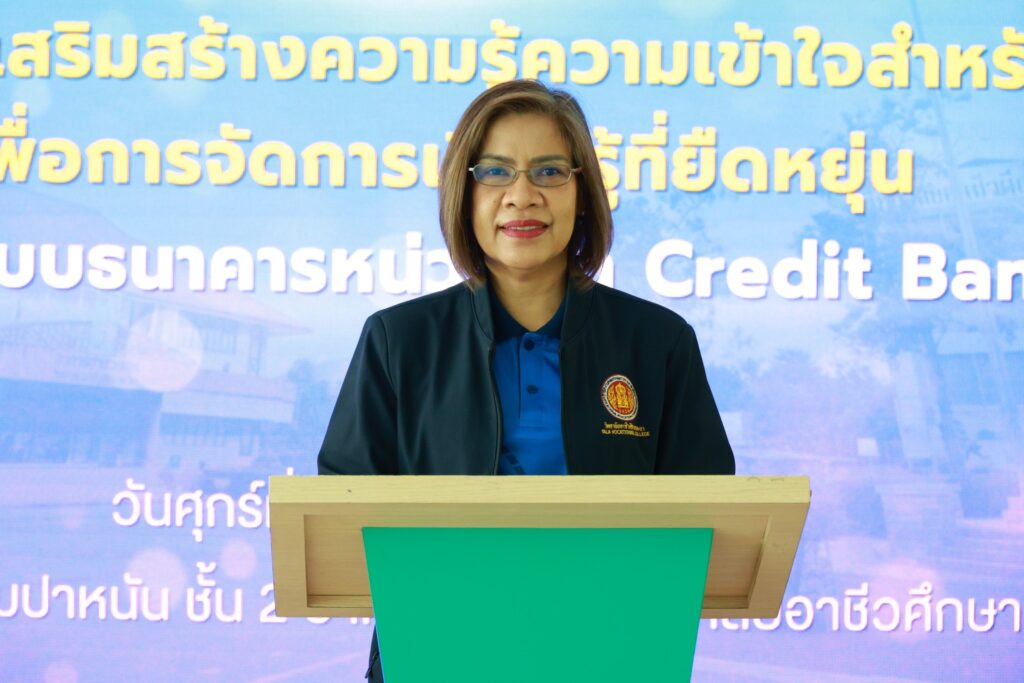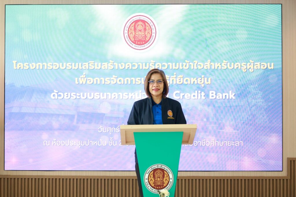 นางประกายแก้ว ศุภอักษร ผู้อำนวยการวิทยาลัยอาชีวศึกษายะลา เป็นประธานพิธีเปิดโครงการอบรมเสริมสร้างความรู้ความเข้าใจสำหรับครูผู้สอน เพื่อการจัดการเรียนรู้ที่ยืดหยุ่น ด้วยระบบธนาคารหน่วยกิต Credit Bank โดยมี นายพงศธร วรรธนะปิติ รองผู้อำนวยการฯ ฝ่ายบริหารทรัพยากร เป็นผู้กล่าวรายงาน ซึ่งได้รับเกียรติจาก นายวิเชียร บุญเตี่ยว ผู้อำนวยการวิทยาลัยเทคนิคสตูล บรรยายให้ความรู้แก่คณะครู และบุคลากรทางการศึกษา ณ ห้องประชุมปาหนัน วิทยาลัยอาชีวศึกษายะลา