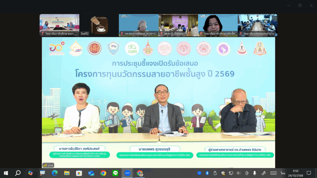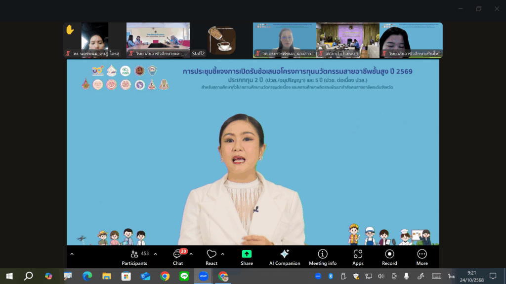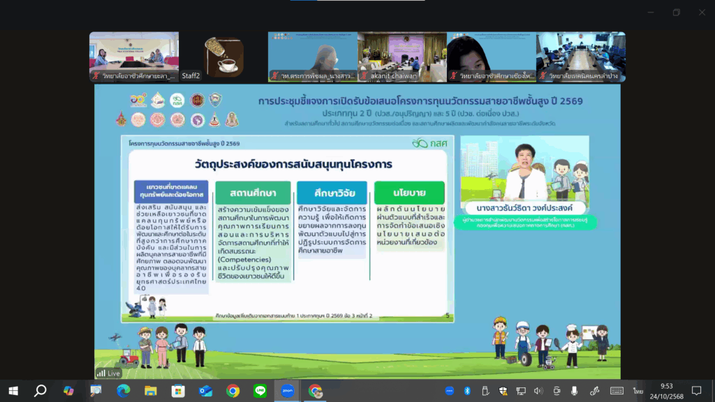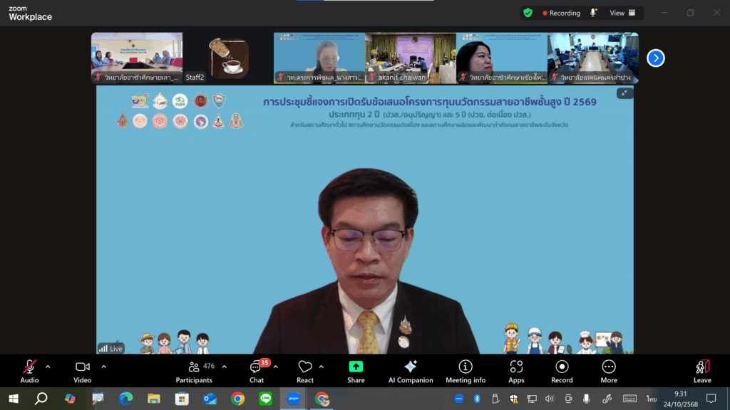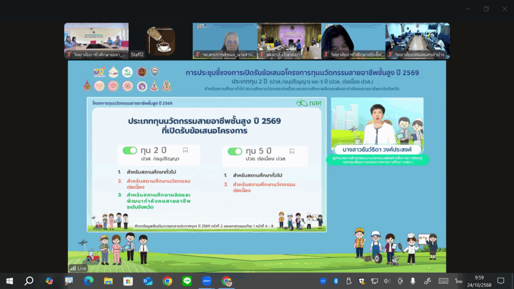 นางประกายแก้ว ศุภอักษร ผู้อำนวยการวิทยาลัยอาชีวศึกษายะลา มอบหมายให้ ครู และบุคลากรทางการศึกษาที่เกี่ยวข้อง เข้าร่วมการประชุมชี้แจงการเปิดรับข้อเสนอโครงการทุนนวัตกรรมสายอาชีพชั้นสูง ประจำปี พ.ศ. 2569 กองทุนเพื่อความเสมอภาคทางการศึกษา (กสศ.) ผ่านระบบอิเล็กทรอนิกส์ (Zoom Meeting) ณ ห้องประชุม Conference อาคารวิทยบริการ วิทยาลัยอาชีวศึกษายะลา