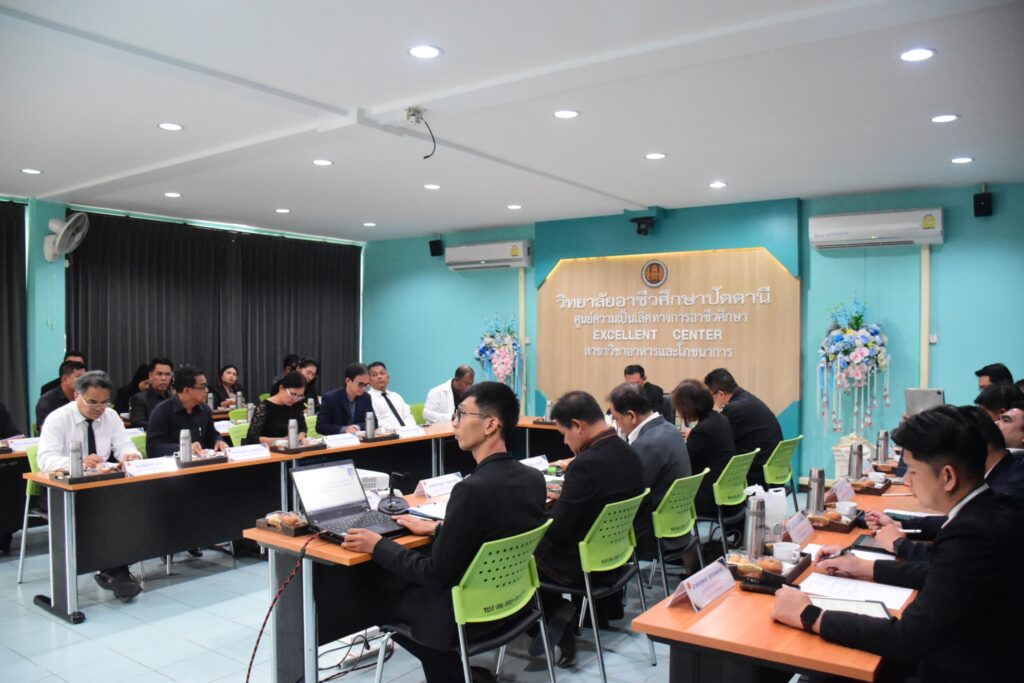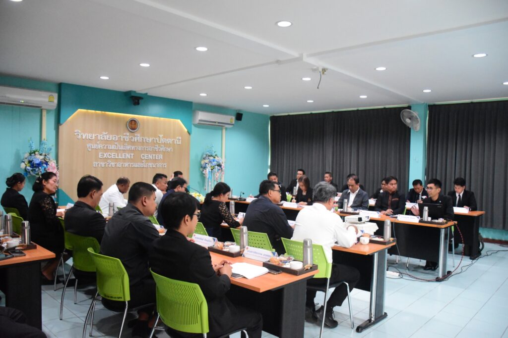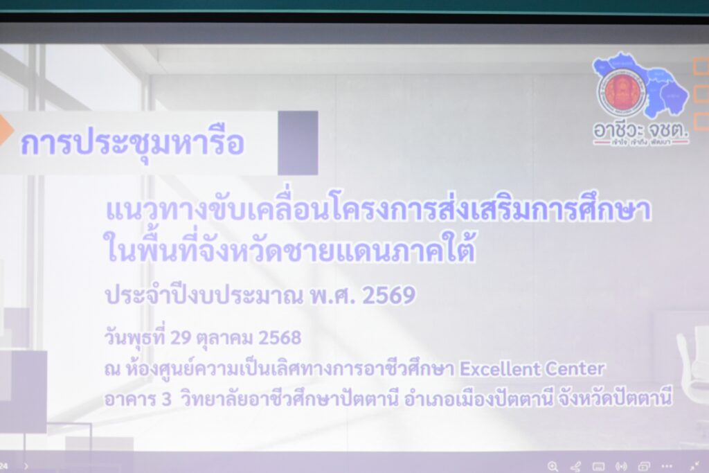 โดยมี นายวิทยา ตั่นยืนยง ผู้อำนวยการวิทยาลัยอาชีวศึกษาปัตตานี เป็นประธานในที่ประชุม พร้อมด้วยผู้บริหาร ครู และบุคลากรทางการศึกษา สถานศึกษาอาชีวศึกษาในจังหวัดชายแดนภาคใต้ เข้าร่วมการประชุม ณ ห้องศูนย์ความเป็นเลิศทางการอาชีวศึกษา วิทยาลัยอาชีวศึกษาปัตตานี