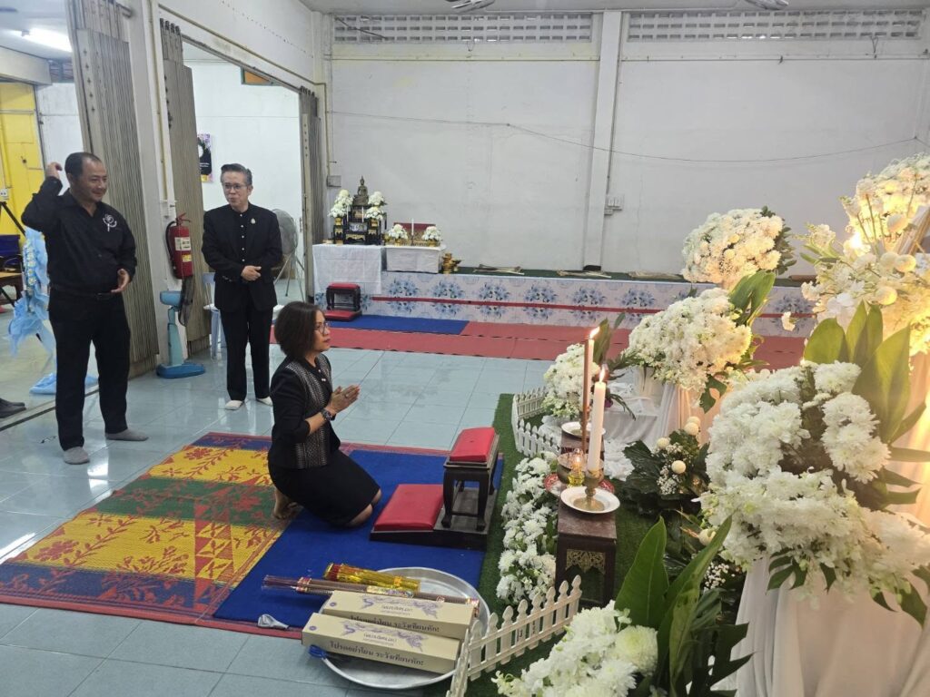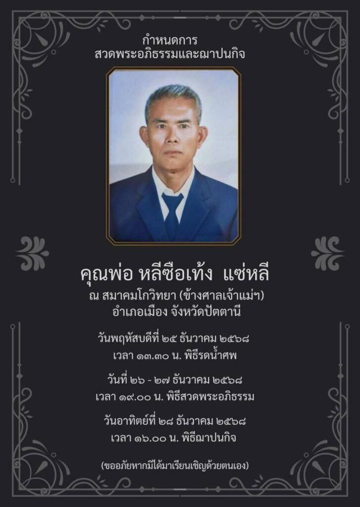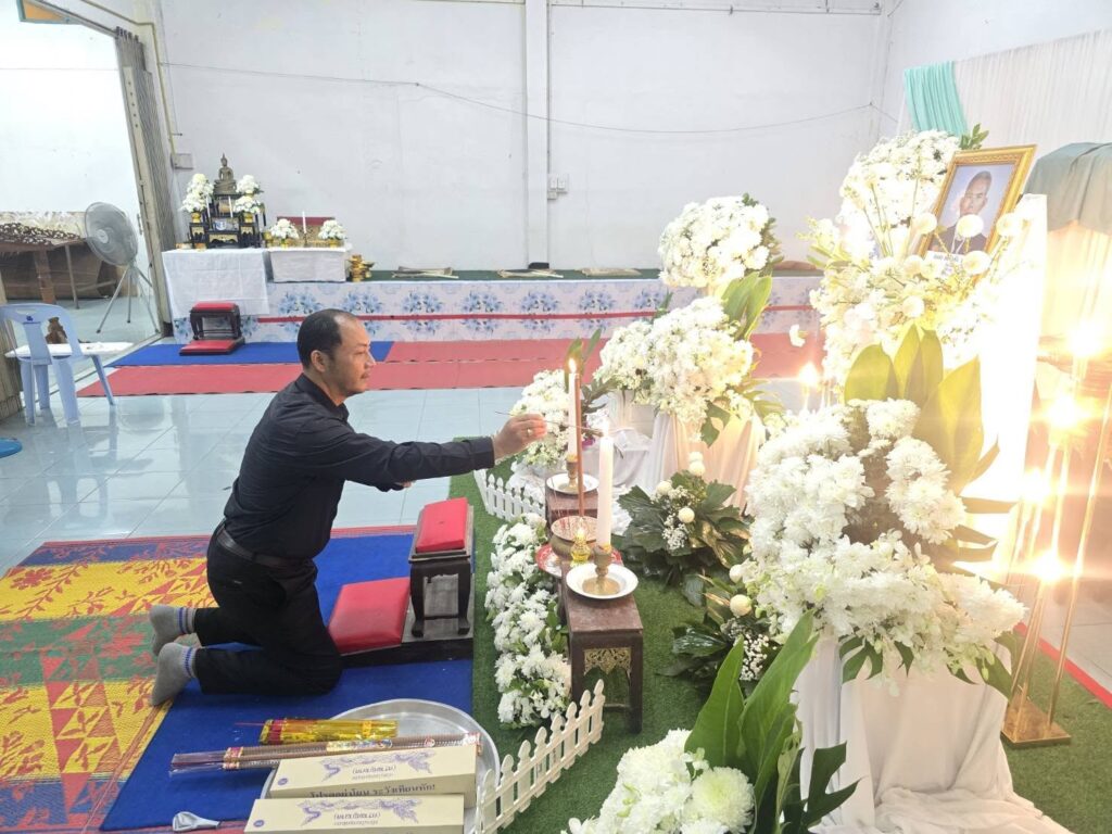 นางประกายแก้ว ศุภอักษร ผู้อำนวยการวิทยาลัยอาชีวศึกษายะลา พร้อมด้วยคณะผู้บริหาร ร่วมแสดงความเสียใจต่อการจากไปของ คุณพ่อ หลีซือเท้ง แซ่หลี บิดาของ ดร.ธีรศักดิ์ อรุณวัชรพันธ์ ผู้อำนวยการวิทยาลัยการอาชีพป่าซาง ณ สมาคมโกวิทยา (ข้างศาลเจ้าแม่) อำเภอเมือง จังหวัดปัตตานี
